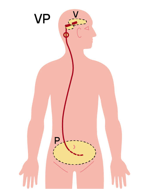 手術の内容は、脳室腹腔シャントというものが多く行われています(2)。頭からおなかにかけて、髄液を流すためのチューブを体内に留置します。約1週間程度の入院が必要です。